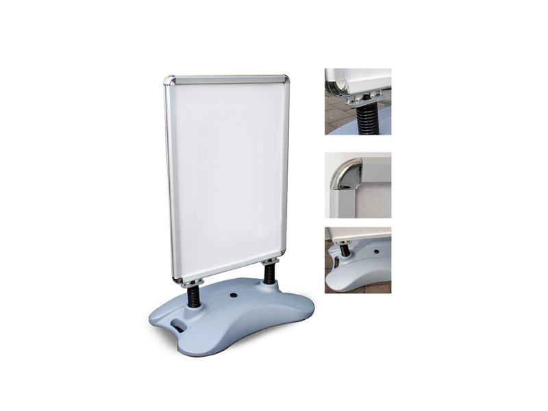 Practical and stylish display option for eye catching outdoor advertising. Utilises two wide profile, round corner A1 snap frames, each with plastic backing panel.