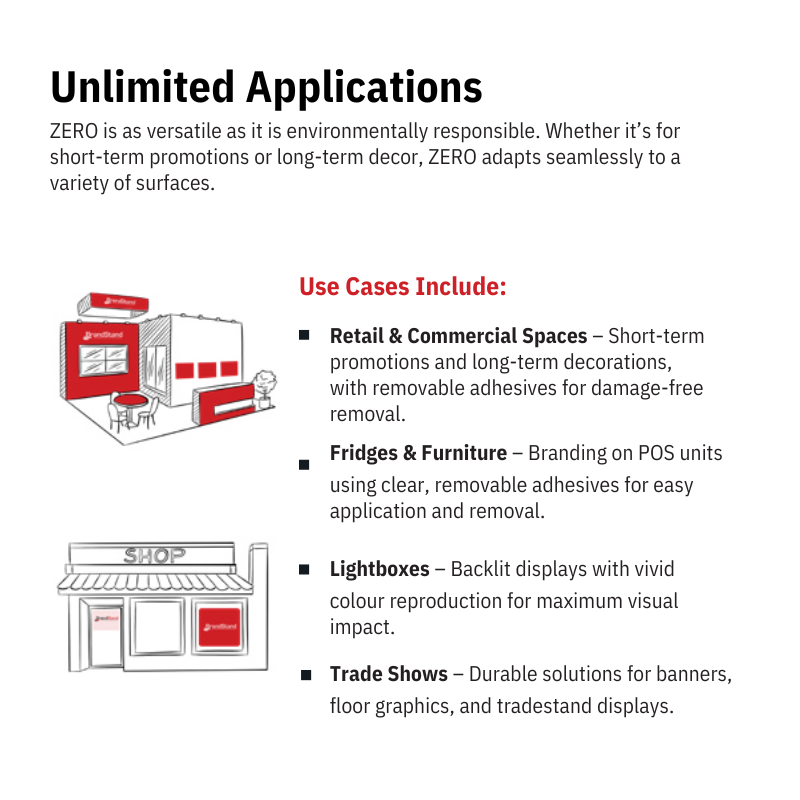 Zero Media can be used to replace vinyl fabrics, PVC display materials, stretch nylon fabrics, paper and card. There are now very few products that can't be replaced with a more sustainable alternative. And it's our mission to persuade you to make the change!