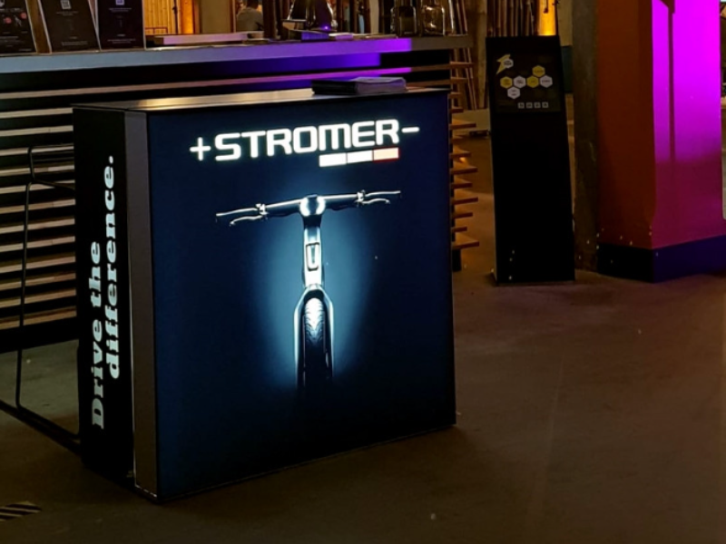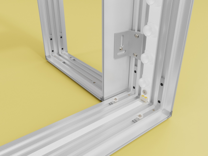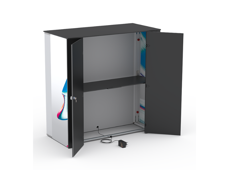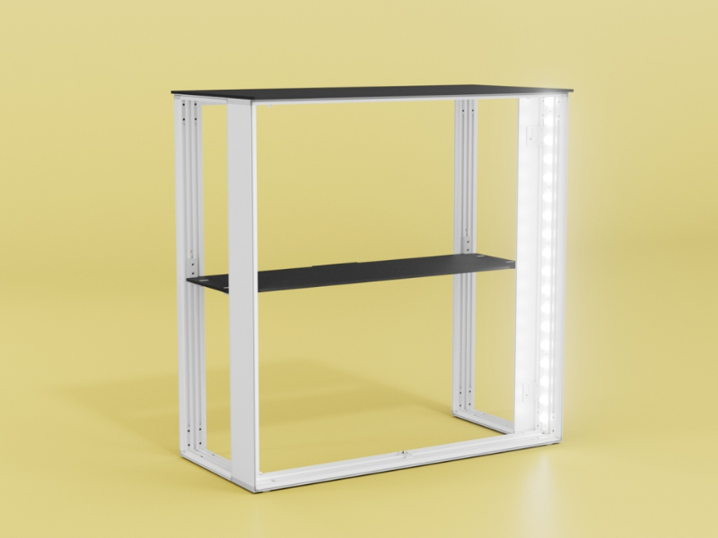 The counter consists of an LED frame 100x100 cm, as well as a counter top and an intermediate compartment for extra storage space. There is also a lockable door at the rear.