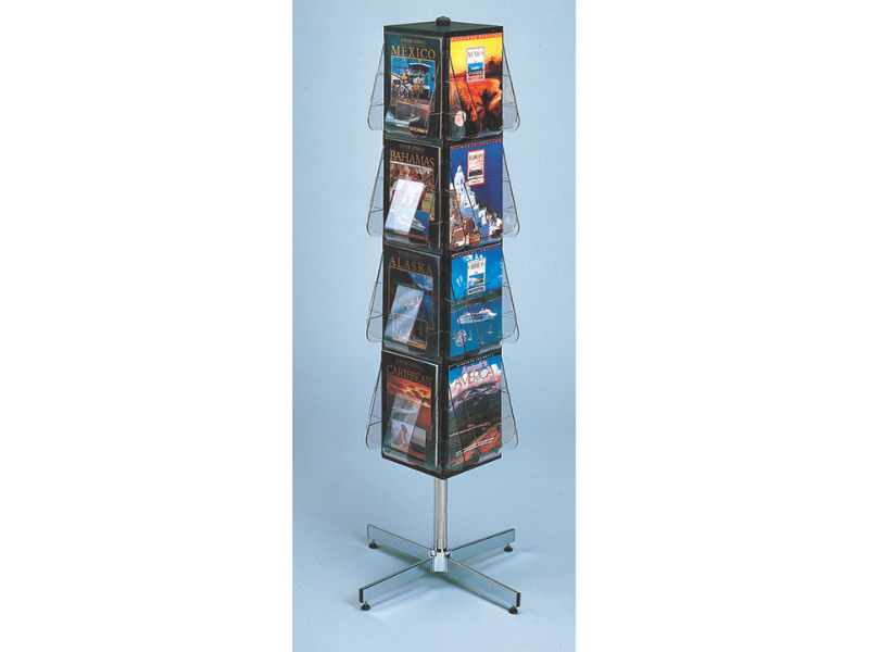 Consists of 6 x A4 literature holders, silver alloy frame & frosted acrylic slanted shelves. Two sided display. Collapsible with aluminium carry case. (280mm wide x 1460mm high x 370mm deep).