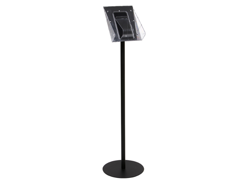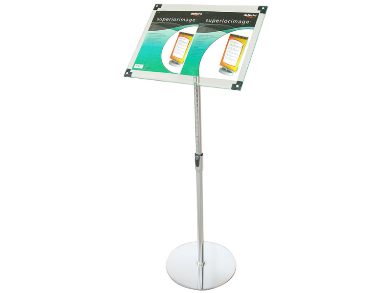 Consists of Floor Standing, 4-sided, A4 x 16, revolving floor rack. Melamine top & bottom, with chrome stand & four-footed glide base