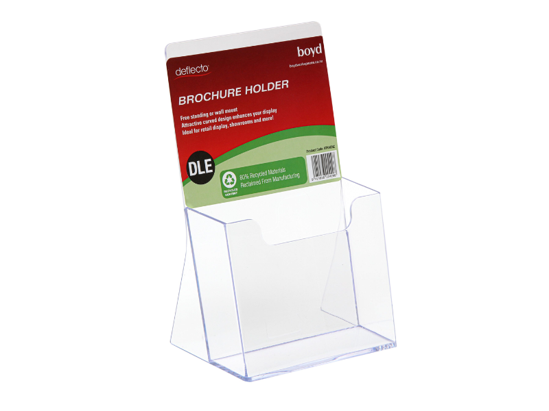 The Recycled Display Range features a selection of display products made from 80% clear recycled materials. This collection includes six high-quality products, offering a variety of brochure holders and sign holders in different sizes. Each product is crafted from at least 80% post-industrial recycled material and is designed to be prominently visible on shelves.