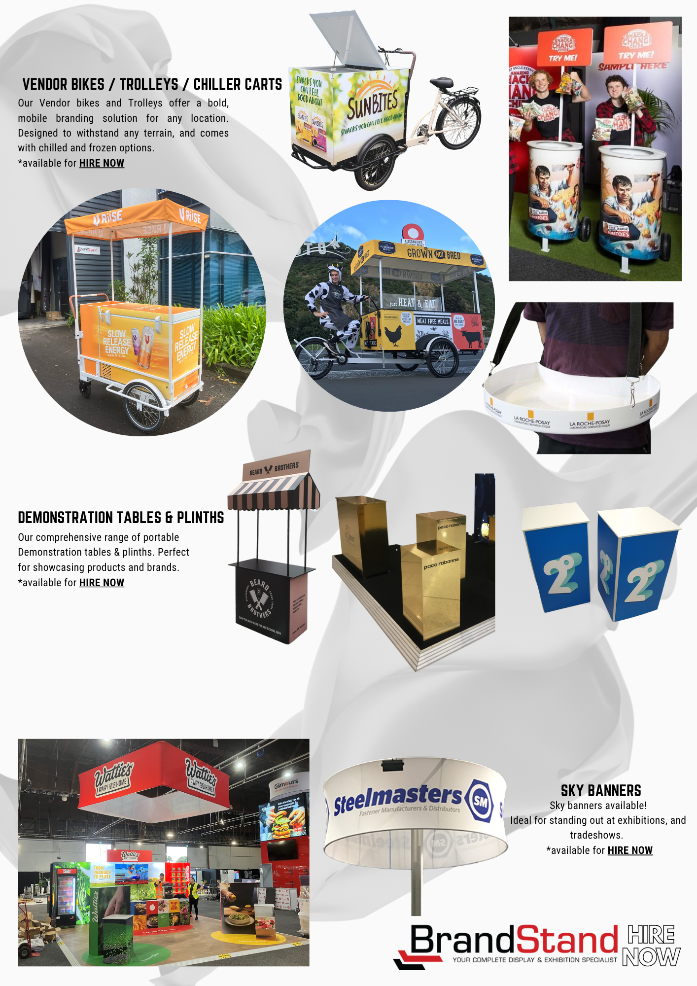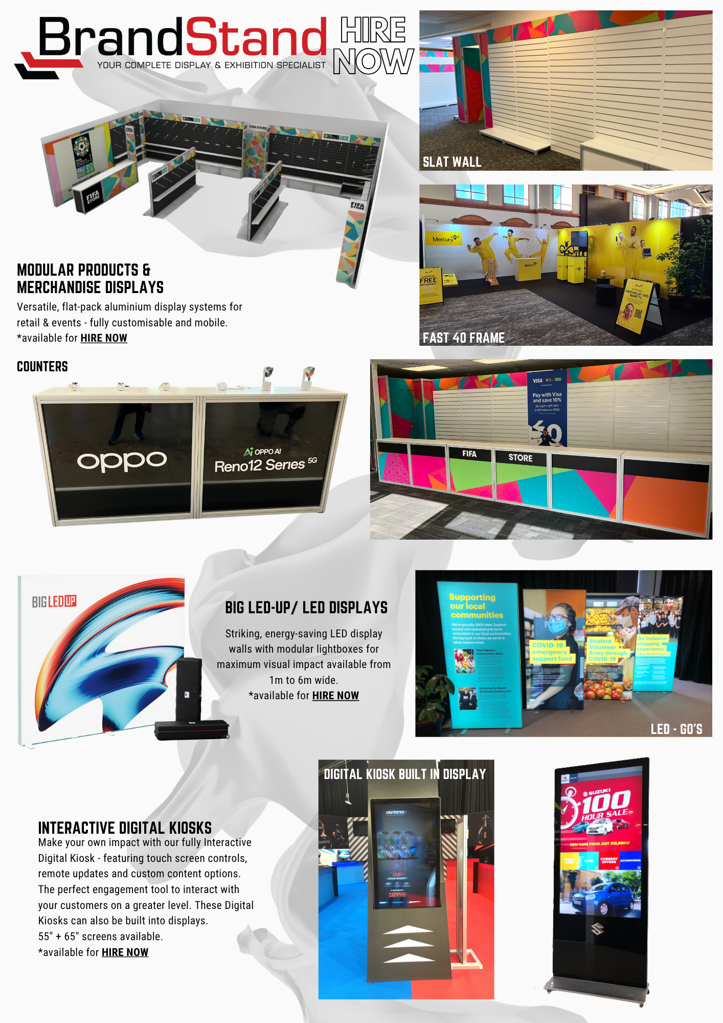 We offer a more cost effective, sustainable option for your exhibition needs. Below is just a sample of products we have available for hire for your next exhibition or trade show. For further information, click on our Hire Catalogue here. Enquire Now!