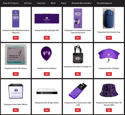Employment Hero login to their very own pages on our website, that can only be accessed via protected passwords. Here they will find images of their branded display products and branded promotional merchandise.