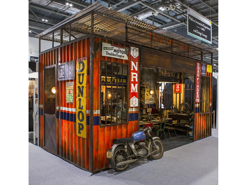 Creating that WOW effect with different materials is one way to get attention. This corrugated iron ‘container’ stand with its bold colours and workshop-style lighting creates interest and intrigue from the outset. It makes people want to stop and look inside.