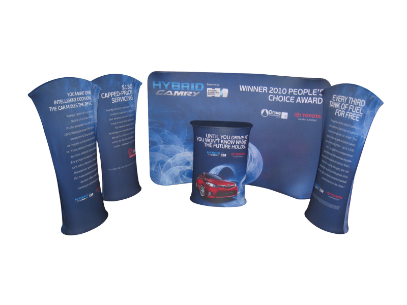The clever “click together” aluminium support poles and the foldable double-sided full colour fabric graphic means this product can be collapsed down into its components for compact storage and economical transportation to your next exhibition, conference or event. It comes in a strong padded carry bag with a shoulder strap.