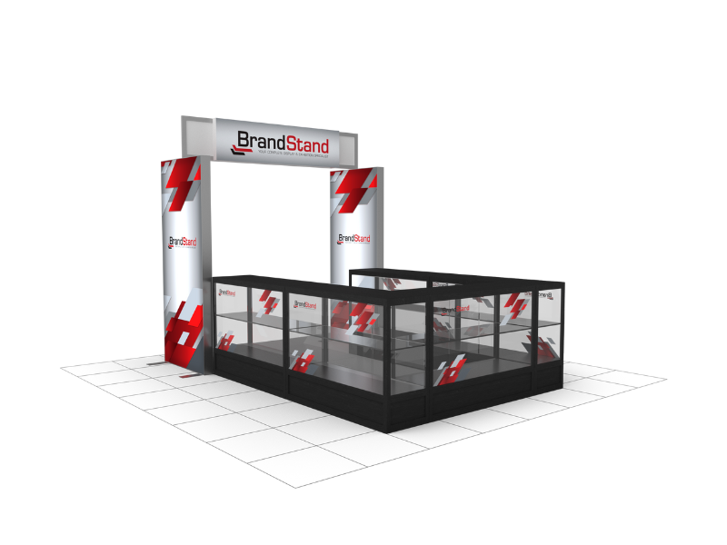 The Exhibition Hire Kit 4 includes: 5 x Glass Display Counters 1200mm wide x 400mm deep x 900mm high (*Does not include graphics for glass counters), 2 x Free-standing Double-sided Lightbox 1m x 2.2m, 1 x Double-sided Horizontal Header Sign. Includes Branding