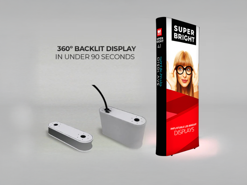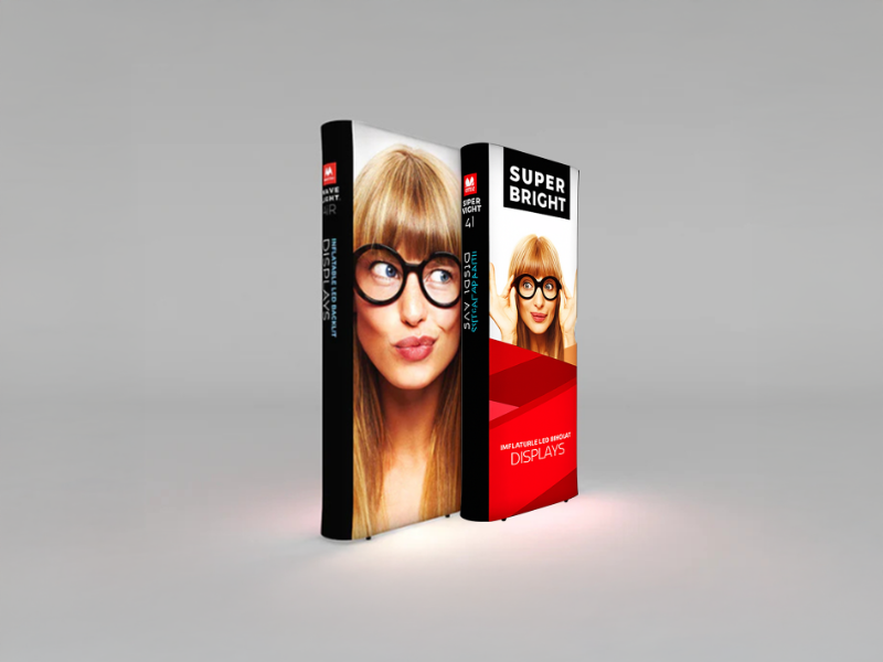 This is our most impressive and durable inflatable, illuminated, double-sided pop up exhibition display wall or backdrop. Built for repeated use in a range of internal environments, the inflatable inner core comes with LED lights and plug-in power supply