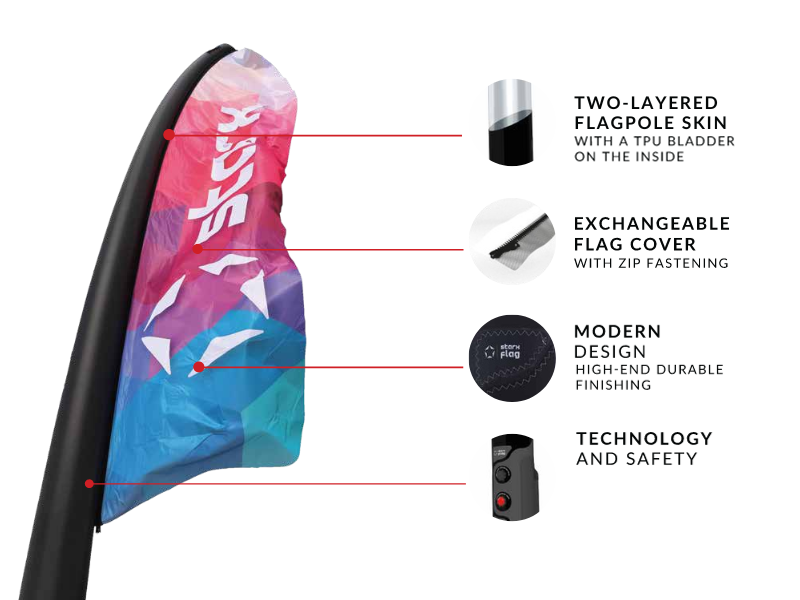 StarX Giant Inflatable Flag represent a whole new era of advertising media which, thanks to compressed air, can be set up in a remarkably short time and can reach incomparably larger sizes. All that is possible thanks to the combination of a TPU sealed inner liner with an outer shell made using the technology, normally implemented in professional sports equipment production.