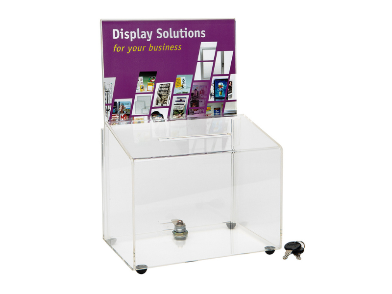Consists of a Desktop Large Ballot Box. A4 Landscape Sign Holder. Clear.