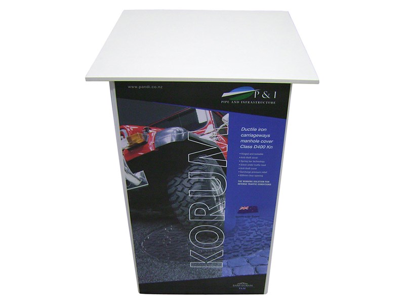 Simply unfold the base, insert the square shape former and the base is ready. Then add the graphic (if supplied separately) and top and assembly is complete. A single plinth should take one person less than 3 minutes to assemble.