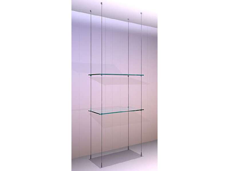 Ceiling to floor shelving kit with 4m long cables complete with top/bottom fixings, 2 x A3 drilled and slotted glass shelves and 8 x CS01 supports in satin chrome.